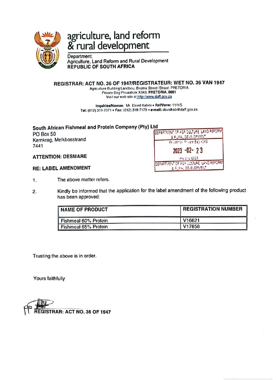 Product Registration Number: V16621 Minimum 60% Protein with high digestibility. To be used in standard feed formulations